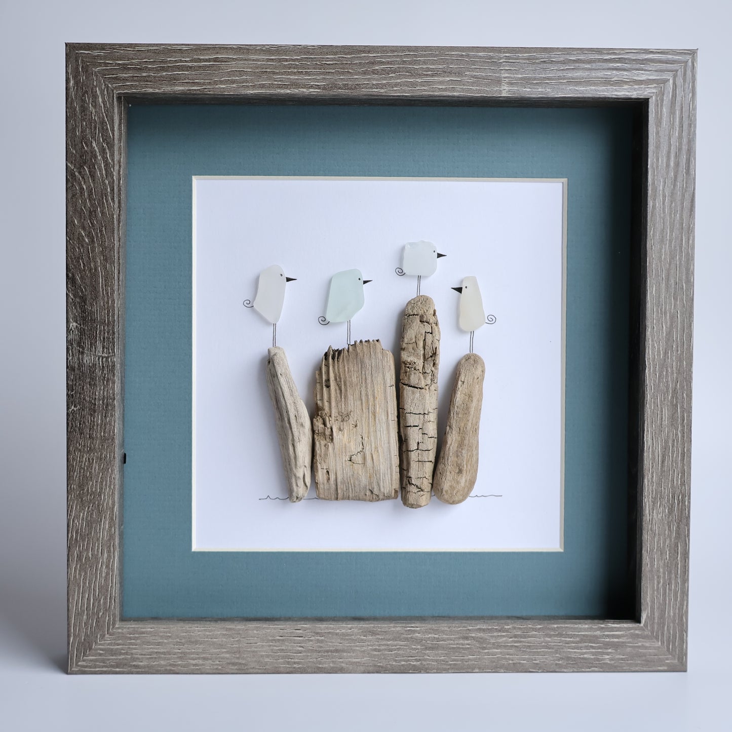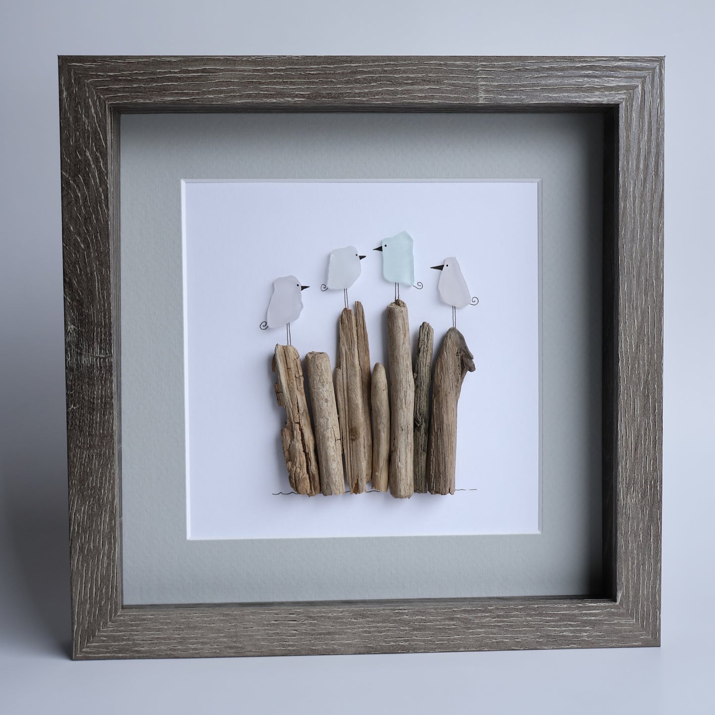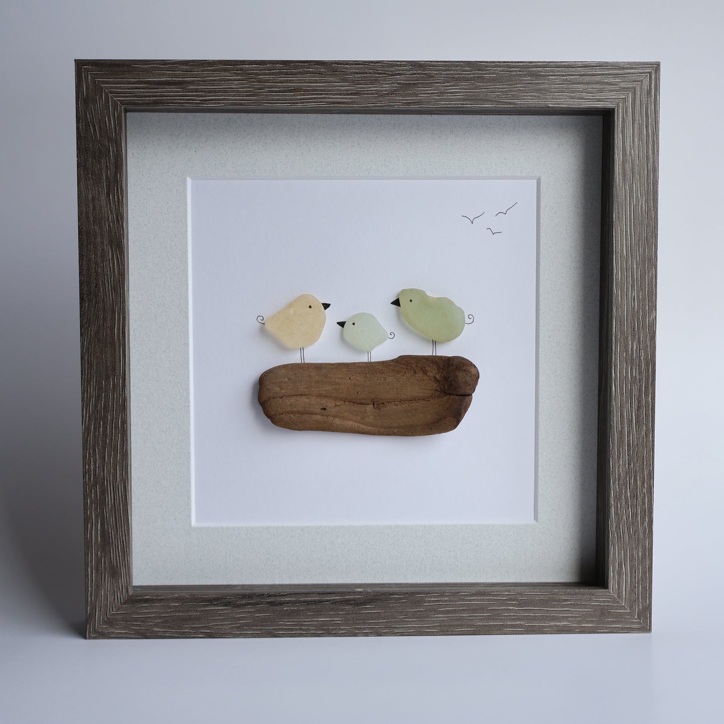 Three Sea Glass Birds on Shells, Coral & Sand Dollar