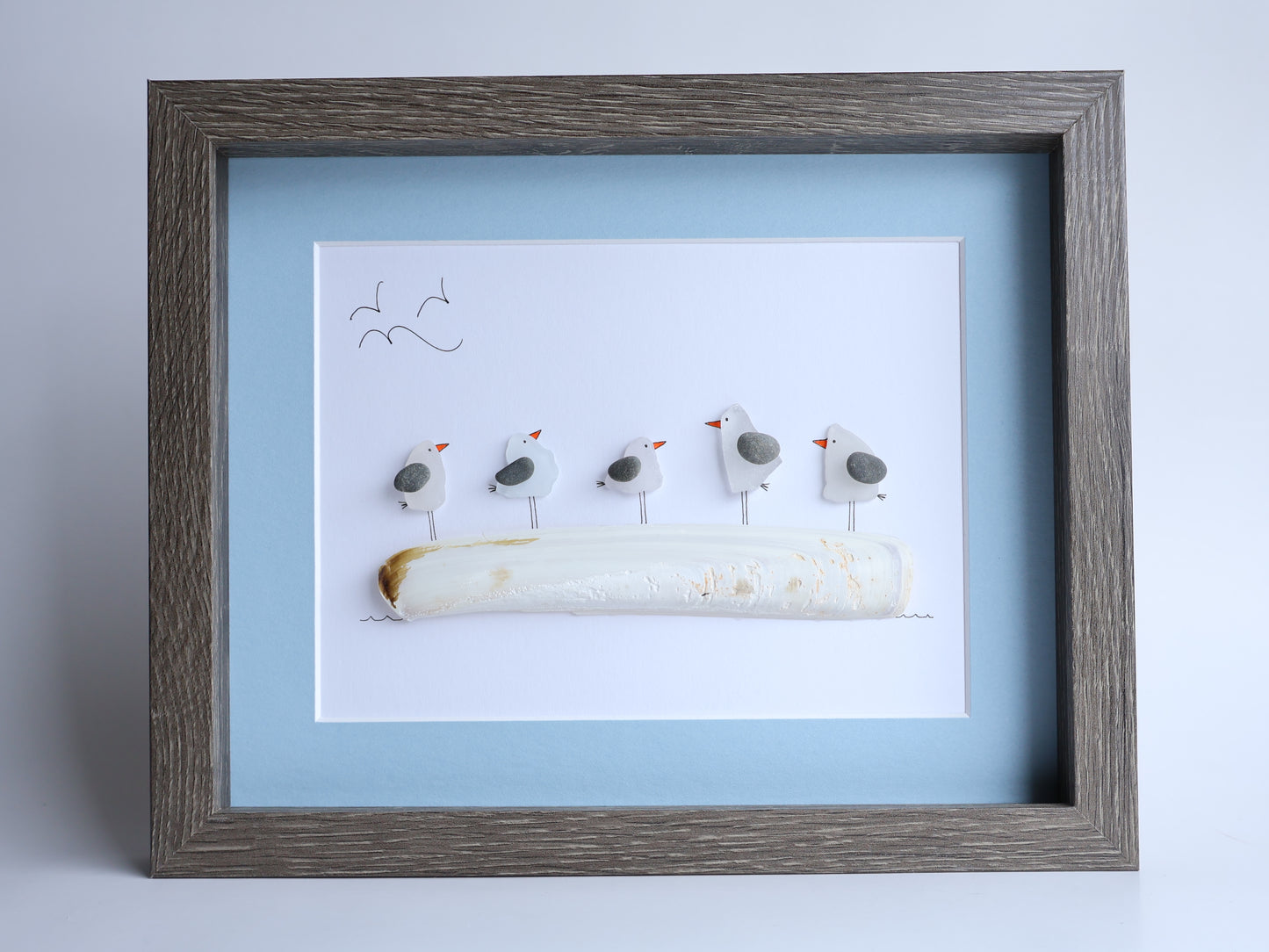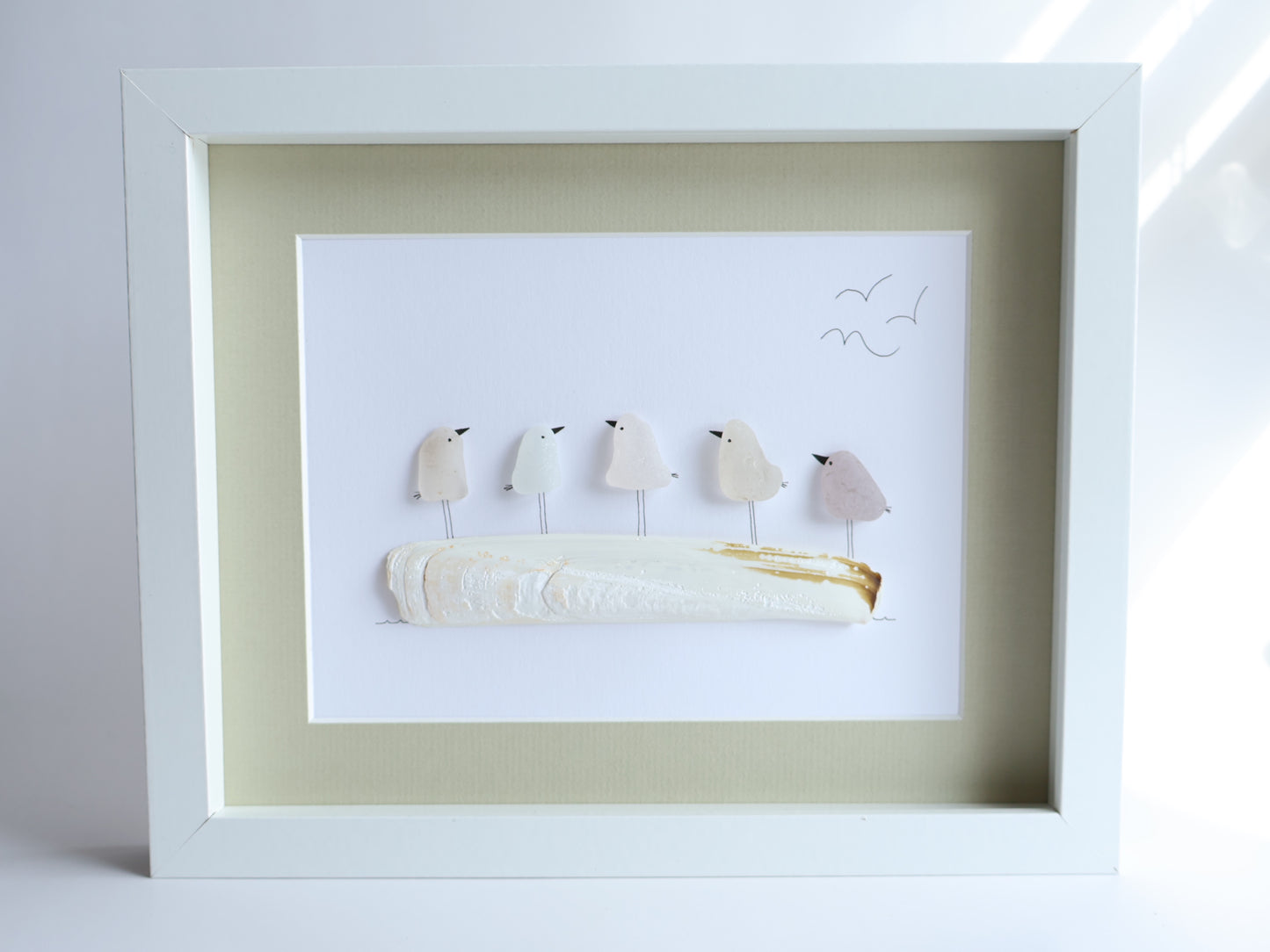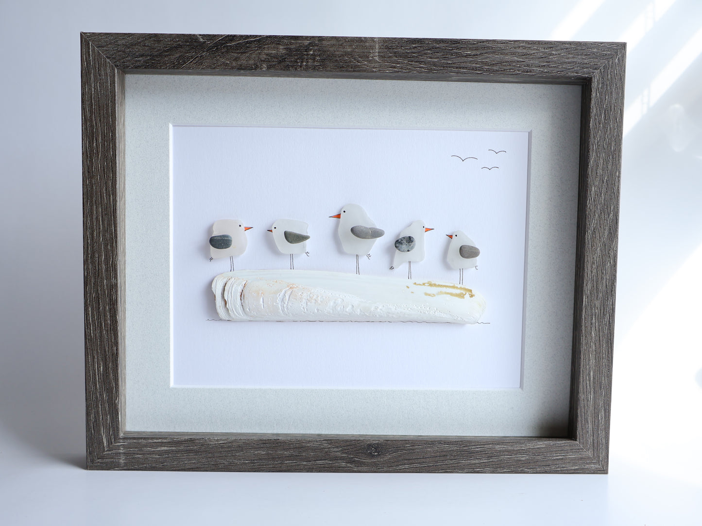 Five Sea Glass Seagulls on Driftwood