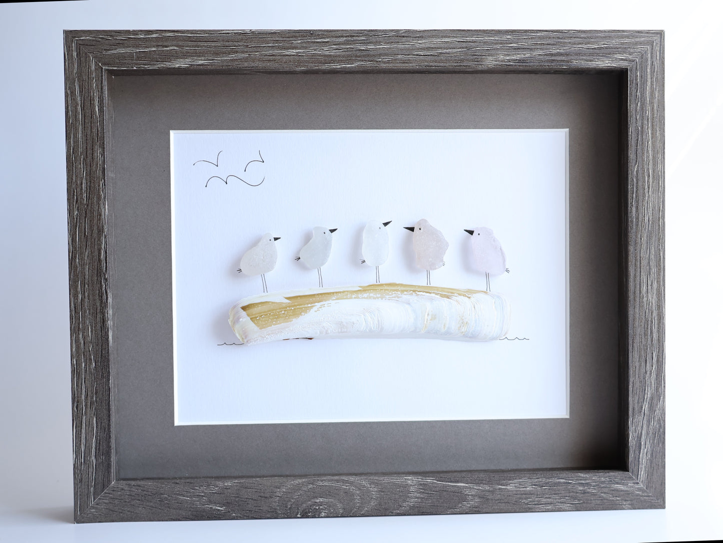 Five Sea Glass Birds on Driftwood