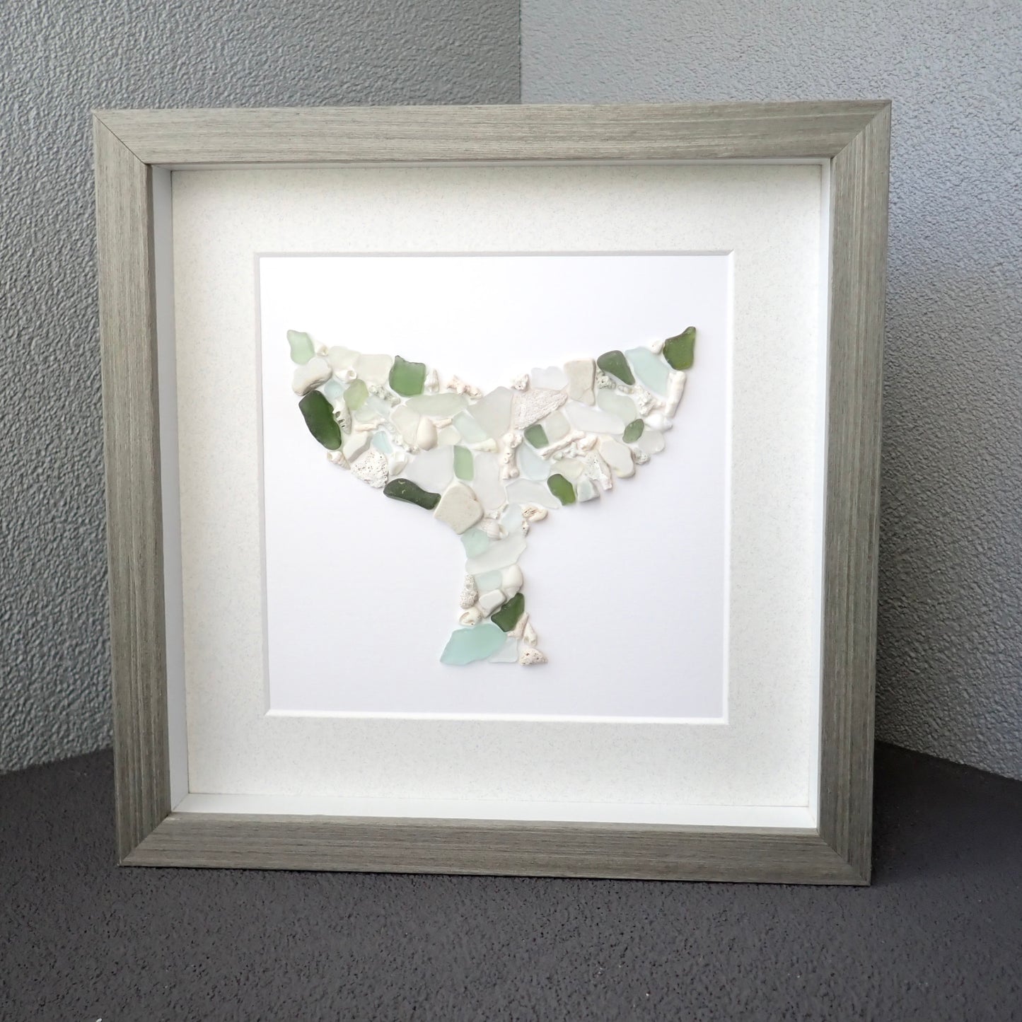 Espuma de mar Vidrio de mar verde, coral, conchas y mosaico de cerámica Imagen de cola de ballena
